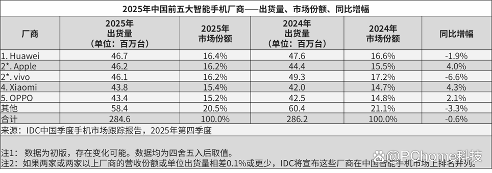整体而言,2025年,中国智能手机市场出货量约2.85亿台,同比下降0.6%。其中华为出货量为4670万台,同比下跌1.9%,位列第一;苹果、vivo、小米、OPPO分别位列第二-第五位,荣耀跌出TOP 5榜单。