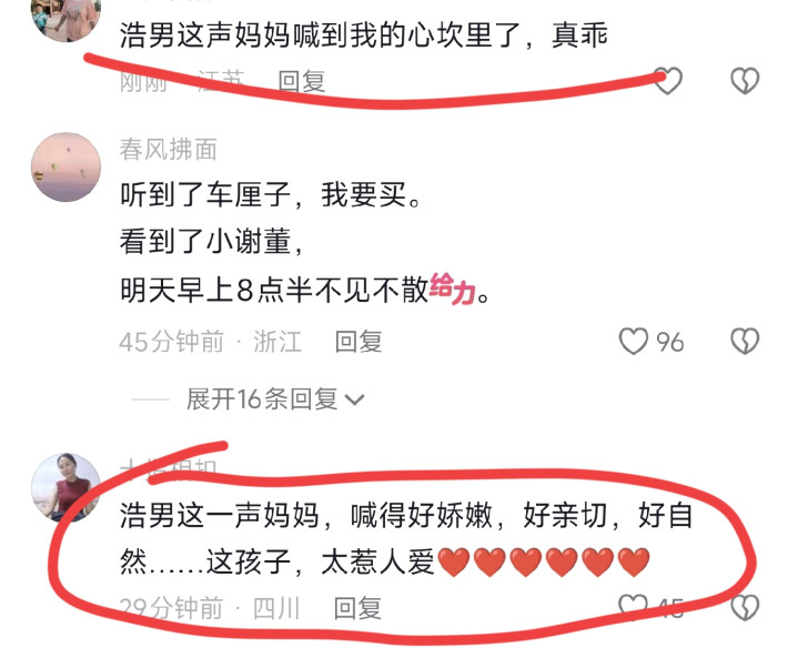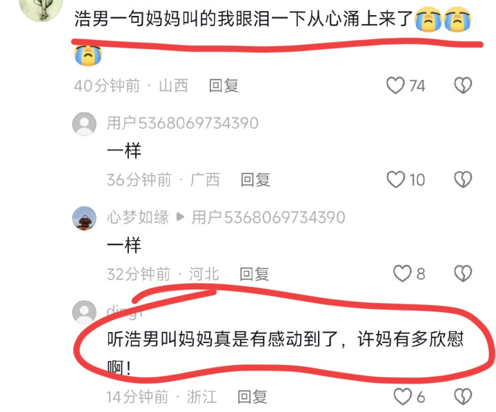 有网友说:浩男一句妈妈叫的我眼泪一下子就涌上来了