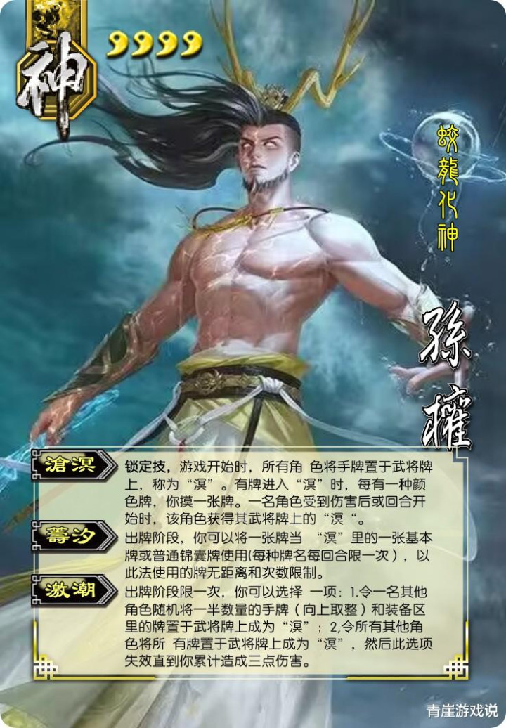 一技能【沧溟】是锁定技,开局就能将所有人手牌扣起来!然后孙权自己必定可以摸两张牌。斗地主、主公身份时,神孙权先手时其他角色被清空所有牌任人宰割,神孙权最适配的武器莫过于古锭刀了。