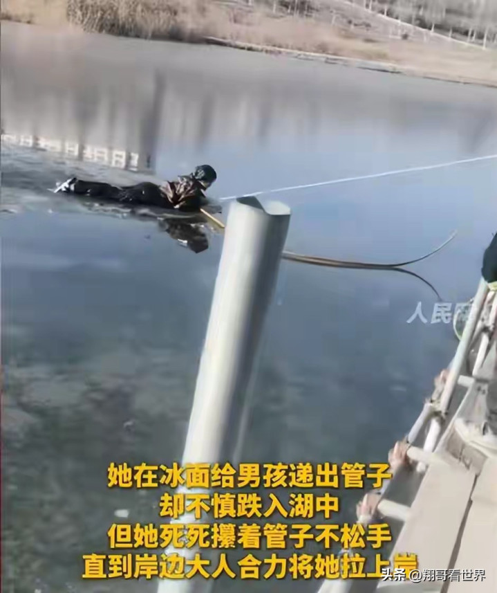 她接过群众找来的塑料水管,毫不犹豫地趴下,匍匐在冰冷的湖面上,一点点向窟窿边缘挪去。
