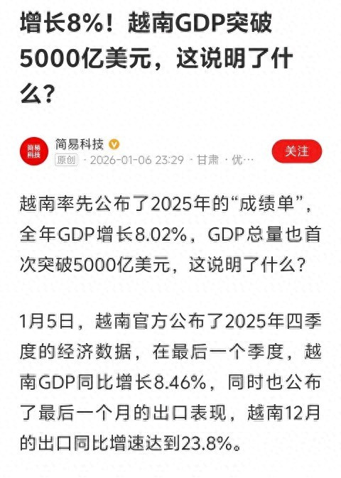 确实,都是因为越南执行社会主义制度,以及共产党的英明领导!超过了同一区域实行腐朽资本主义制度的泰国、菲律宾这些国家。但目前越南那个国家基础设施差到离谱,环境保护基本没有,电力供应十分短缺。第二梯队的国家已经没有机会了。大国都很默契的在封锁对第二梯队国家工业技术的发展。