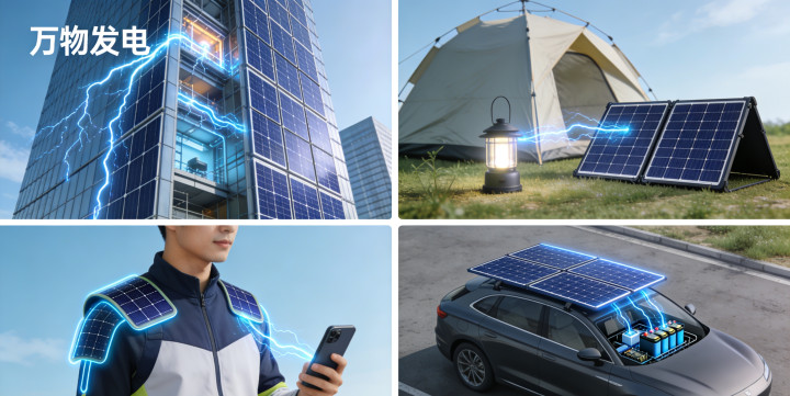 这一突破可不是小事,直接给钙钛矿电池的大规模商业化铺平了道路。以后它的应用场景能多到你想象不到:因为轻薄柔韧,它可以直接印刷在曲面玻璃上,让摩天大楼的外墙变成“发电墙”,白天吸光发电,晚上点亮灯光,又环保又炫酷;可以贴在露营装备上,户外探险、自驾游再也不用担心手机没电、帐篷没灯,真正实现“用电自由”;还能印在纺织面料上,做成能发电的衣服、背包,走在路上就能给电子设备充电,再也不用为续航焦虑;甚至可以集成到汽车车顶、车窗上,让汽车自己发电,大大提升新能源汽车的续航里程。